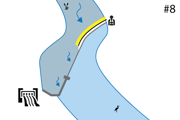 - Die Vorderkante des Kofferdamms muss grundsätzlich die stromaufwärtige Ausrichtung der Schwelle überschreiten. Wir ballastieren die Vorderkante, um zu verhindern, dass der Strom die Leinwand anhebt und dann unter den Kofferdamm sickert.